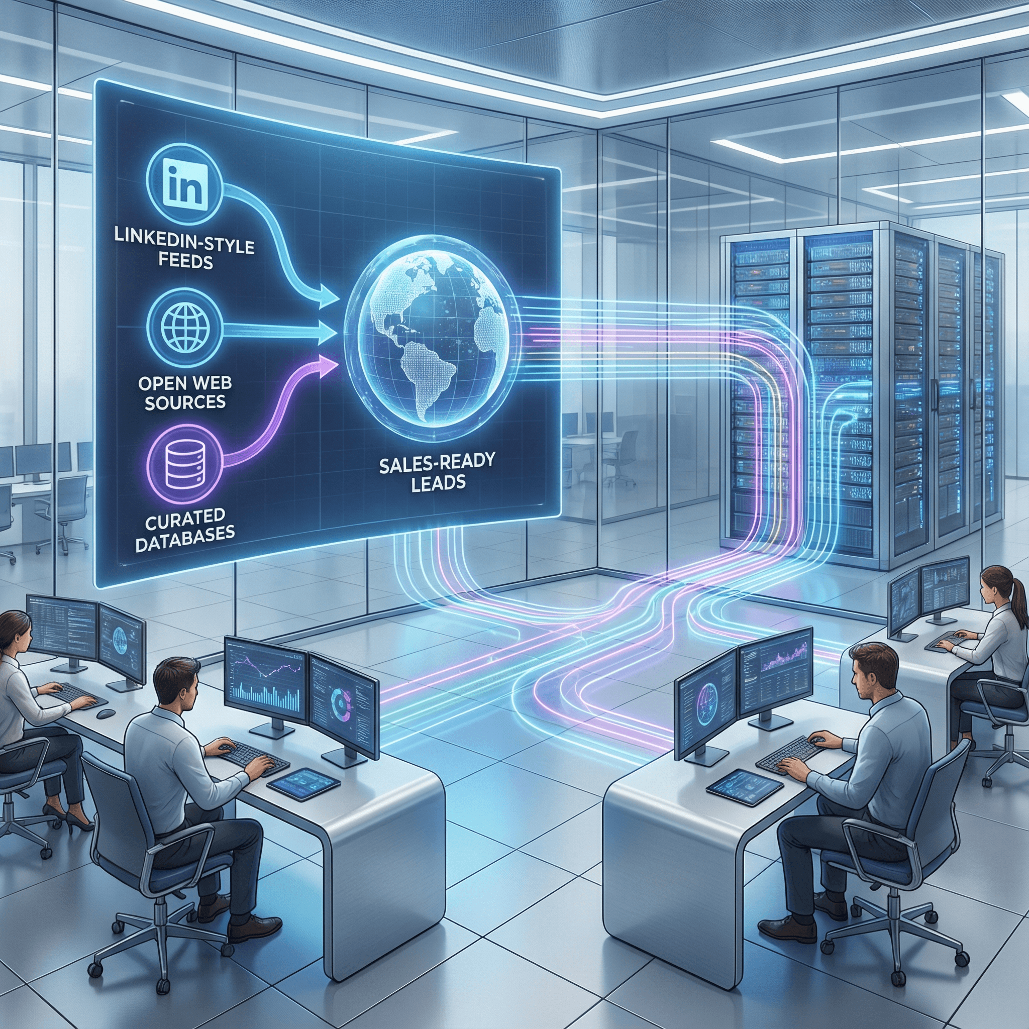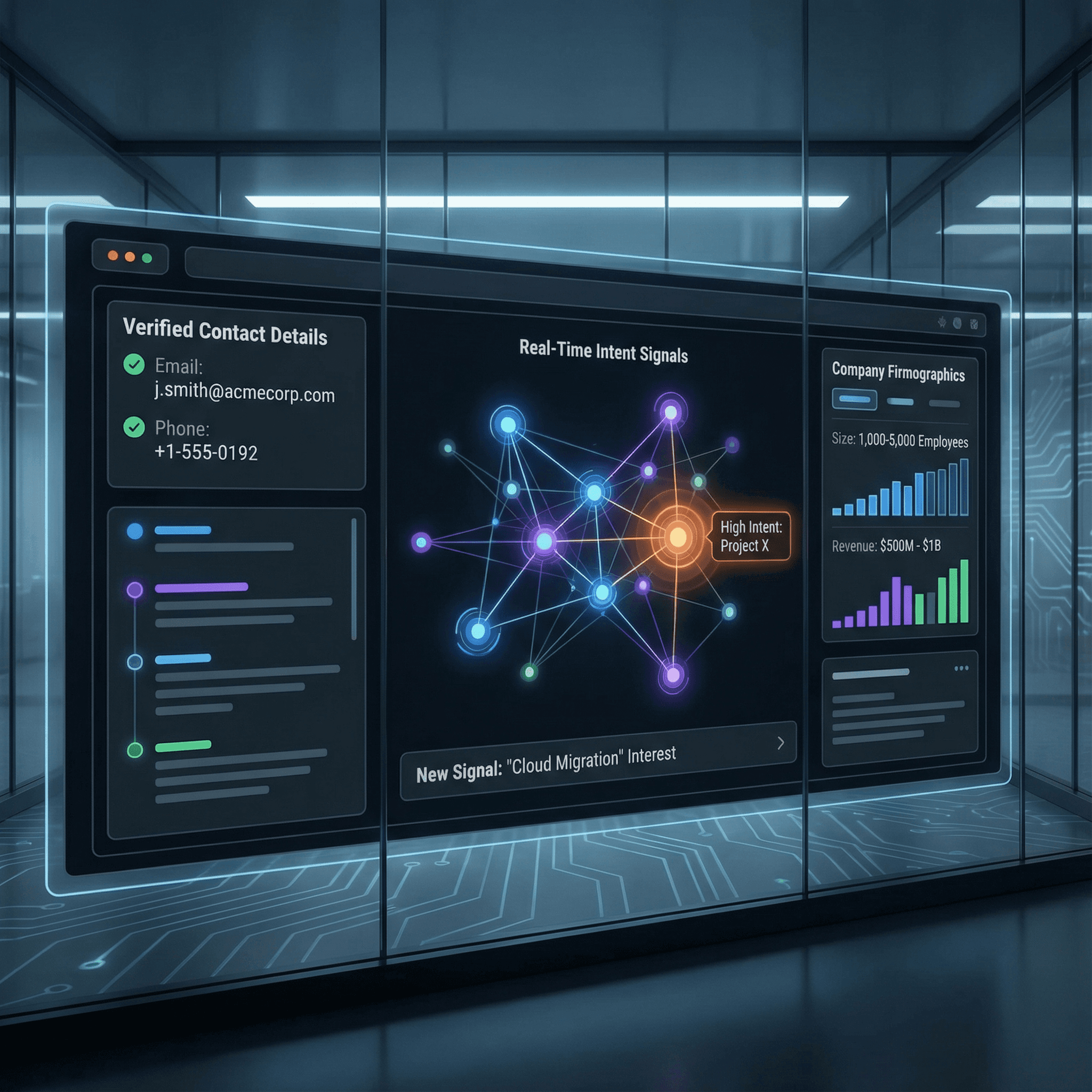 Verified email/phone, company firmographics (size/revenue), and real-time intent signals.