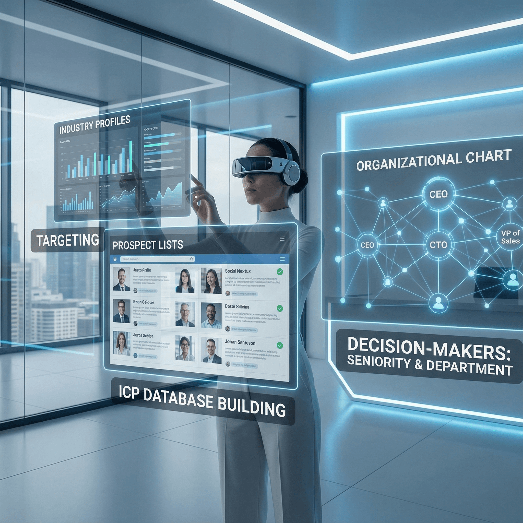 Targeted prospecting, LinkedIn/Industry mining, and identifying decision-makers by seniority and department.