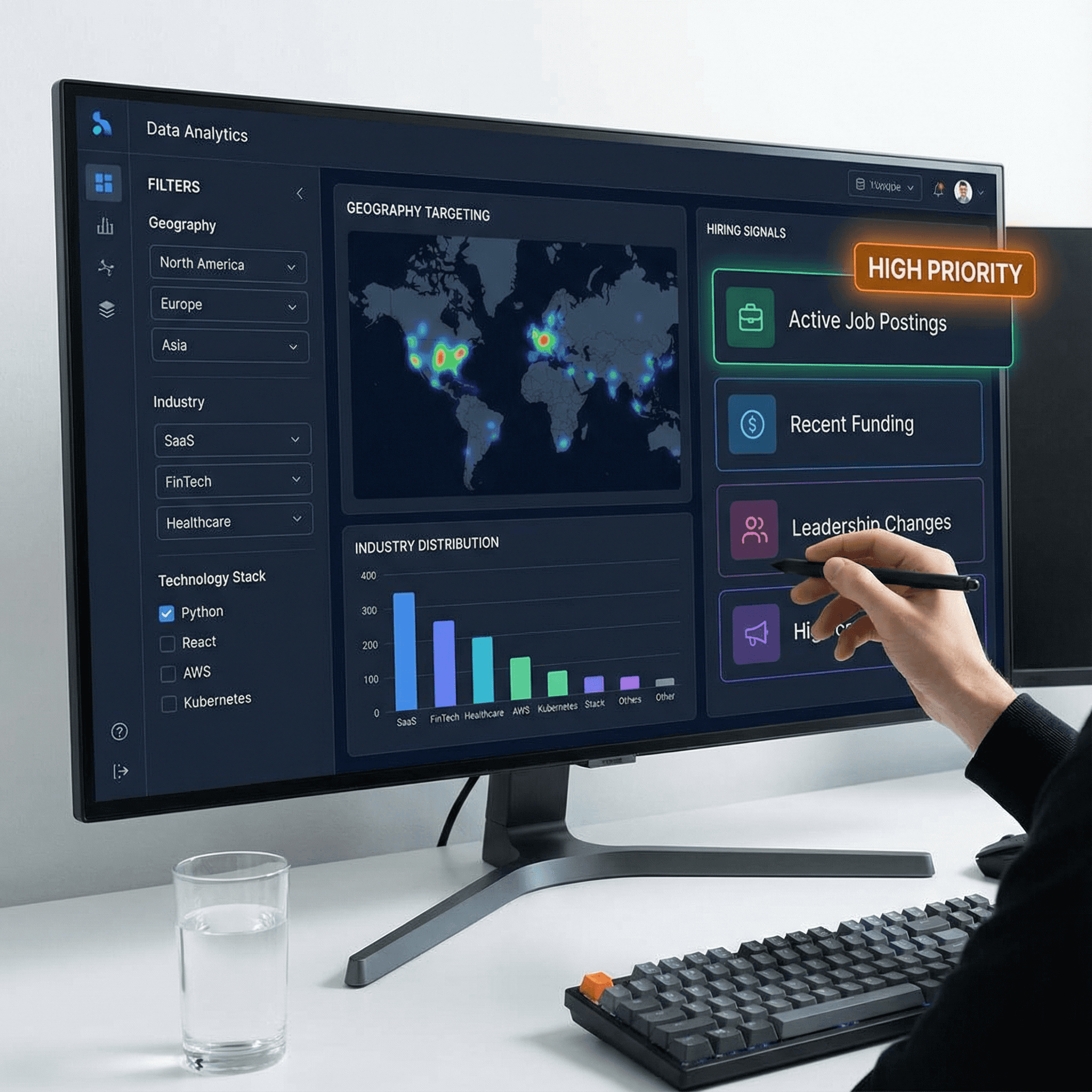 Geography and vertical targeting, technology stack filters, and hiring signal detection.